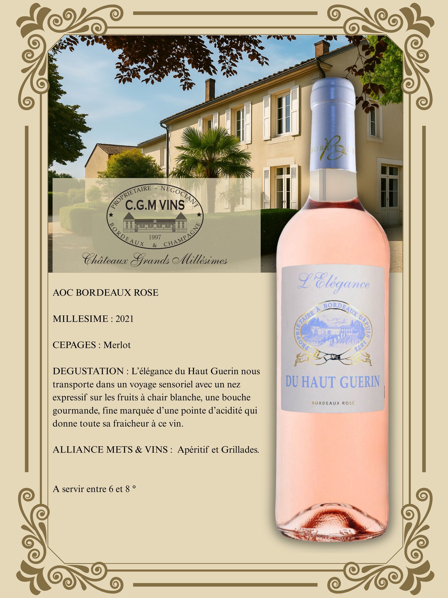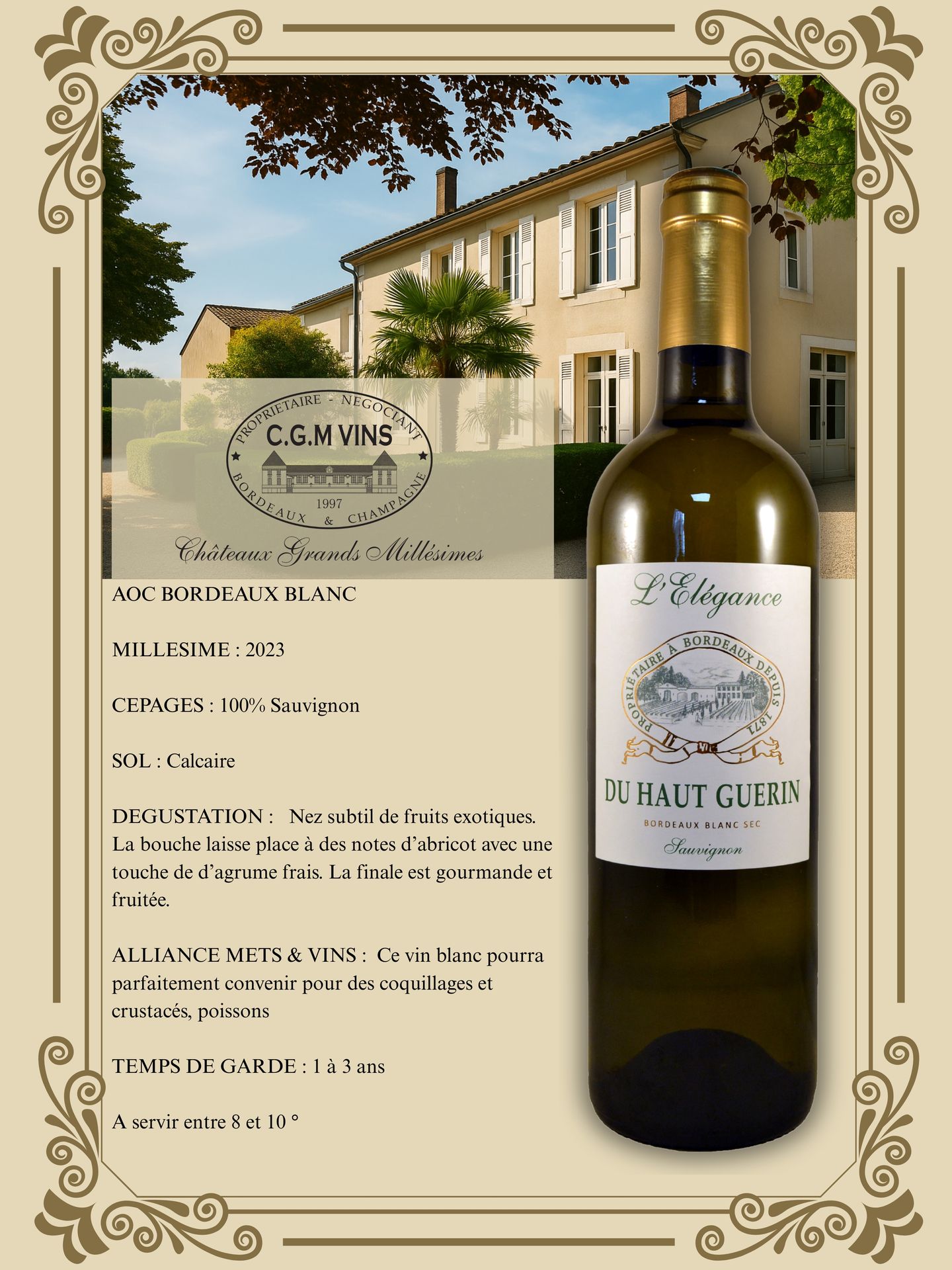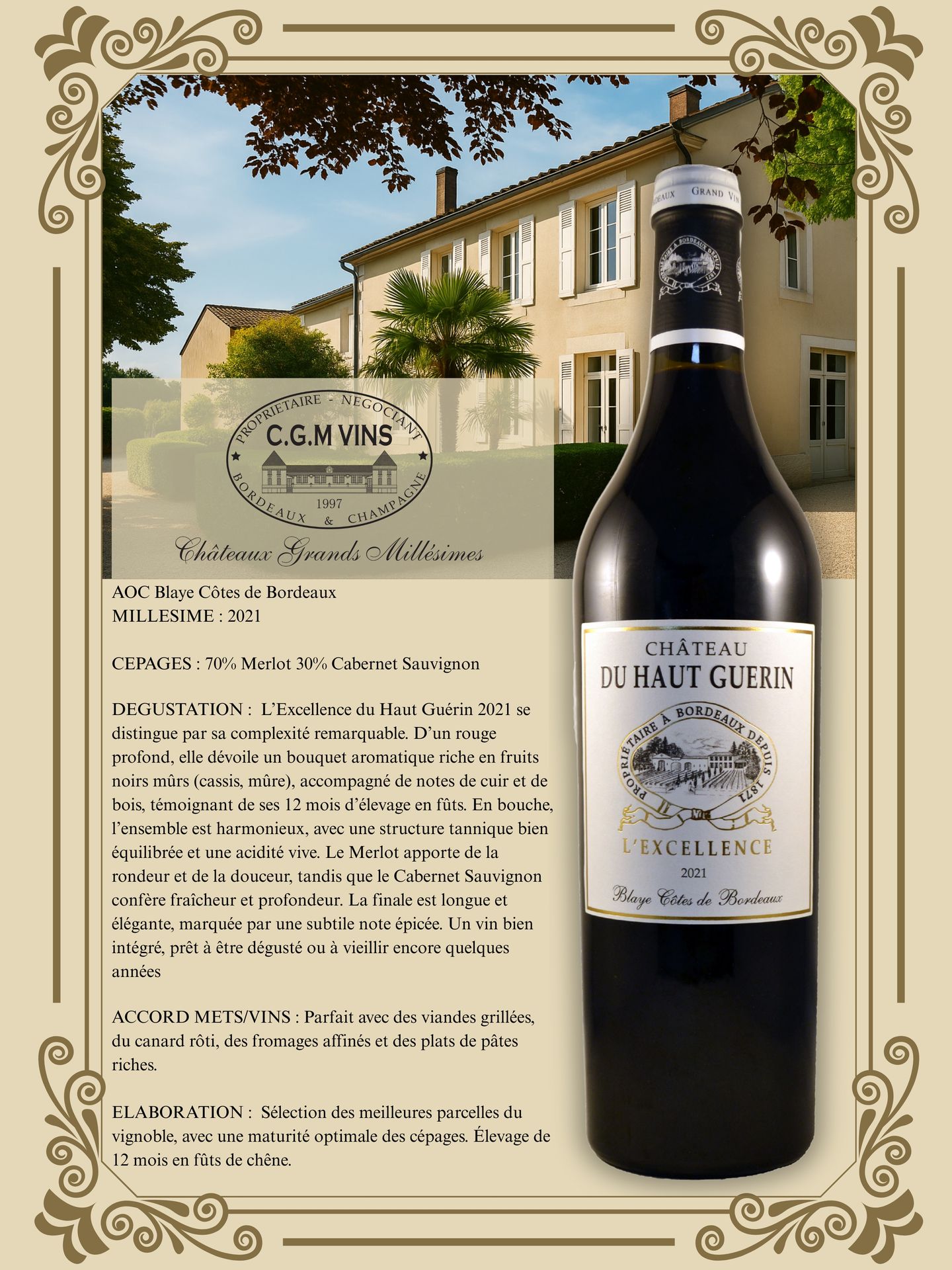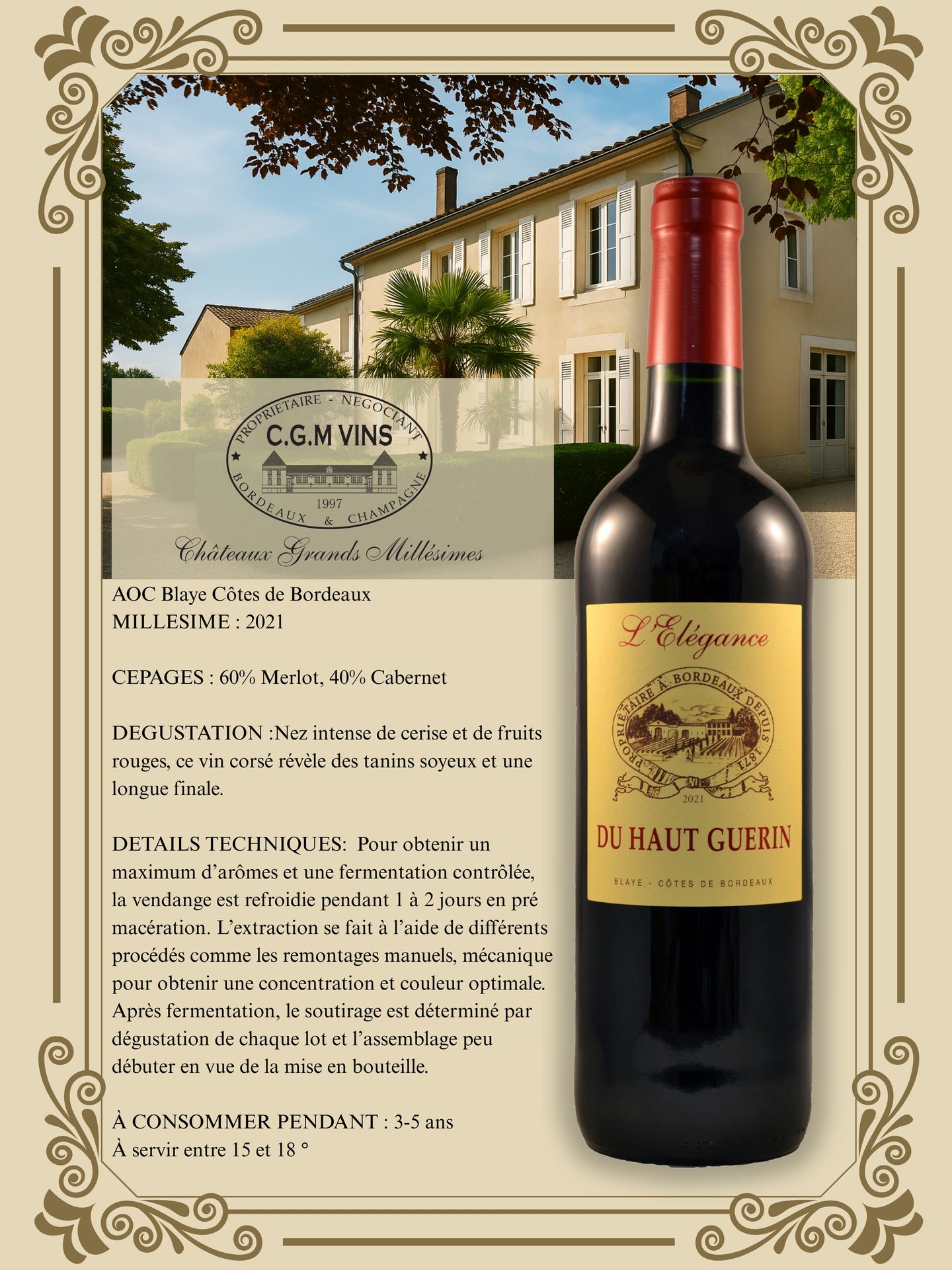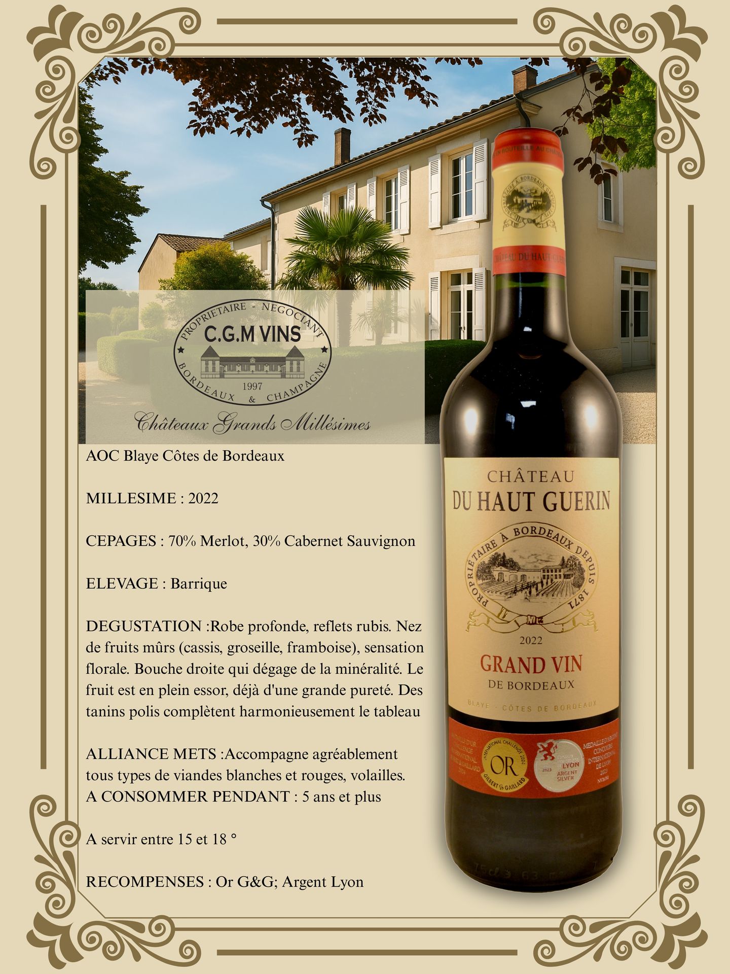 Face aux grands vins du Médoc, se dressent les contreforts du vignoble de Blaye. Le prestigieux Château du Haut Guérin est un fleuron de cette région. CGM Vins, vinificateurs emblématiques de Bordeaux ont su donner à ce cru l'expression des Merlot et Cabernet Sauvignon à ce cru d'exception. Une bouteille inoubliable pour les amateurs de vins fins.