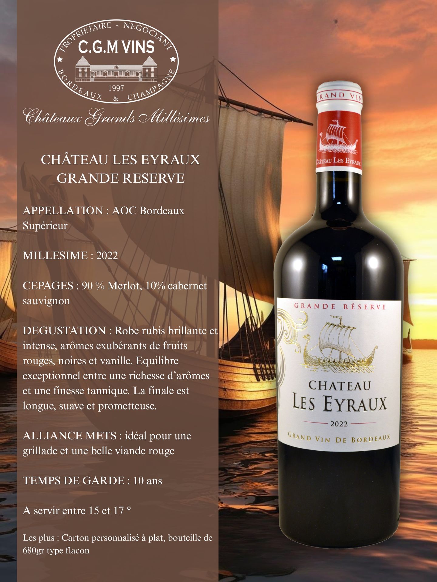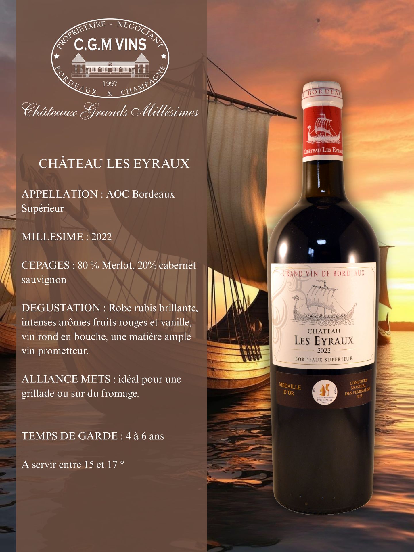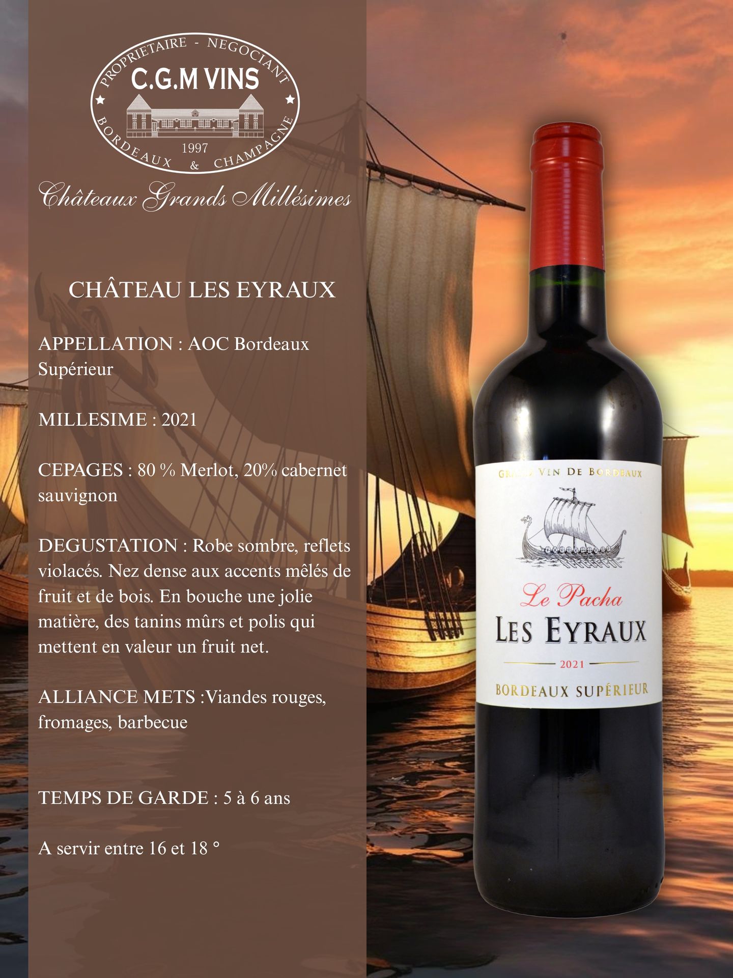En l’an 888 les Vikings, s’emparèrent de Bordeaux. Les drakkars longèrent d’abord le Médoc toutes voiles dehors avant de s’arrêter en ce lieu qui s’appelle aujourd’hui Les Eyraux, la légende raconte que conquis par les vins du cru, les Vikings laissèrent la vie sauve au vigneron contre quelques tonneaux de son meilleur vin. De nos jours ce grand vin à dominante de Merlot s’exporte sur les meilleures tables du monde.