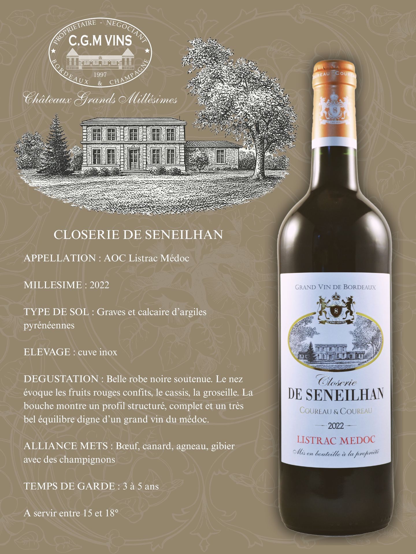 La Closerie de Seneilhan est issue d’une sélection rigoureuse des meilleures parcelles de Listrac Médoc. L’assemblage à dominante de Cabernet Sauvignon typique des communales du Médoc donnera à tout amateur de vins entièrement satisfaction.