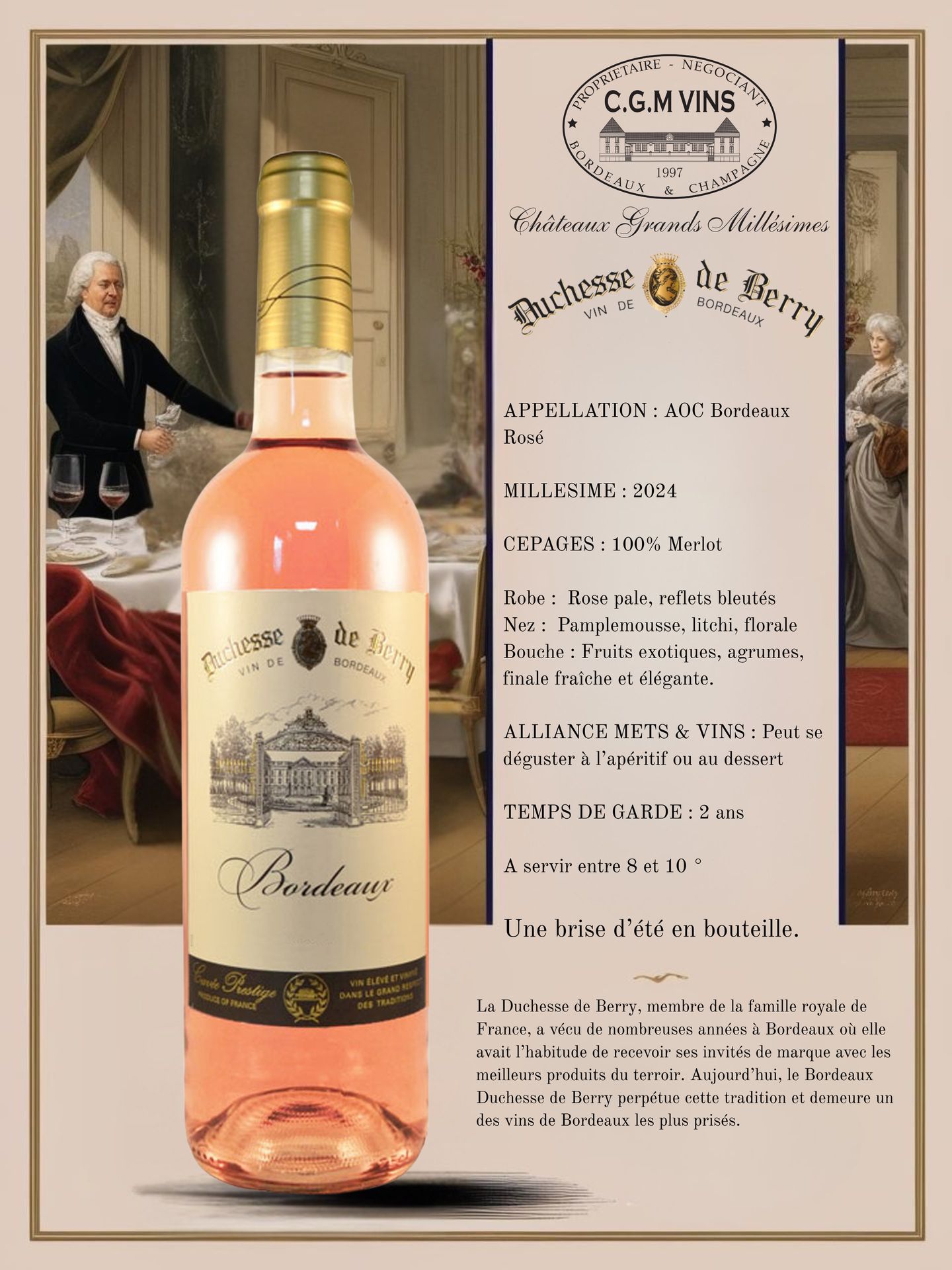 La Duchesse de Berry, membre de la famille royale de France, a vécu de nombreuses années à Bordeaux où elle avait l’habitude de recevoir ses invités et de marquer avec les meilleurs produits du terroir. Aujourd’hui, les Bordeaux Duchesse de Berry perpétuent cette tradition et demeurent des vins de Bordeaux les plus prisés.