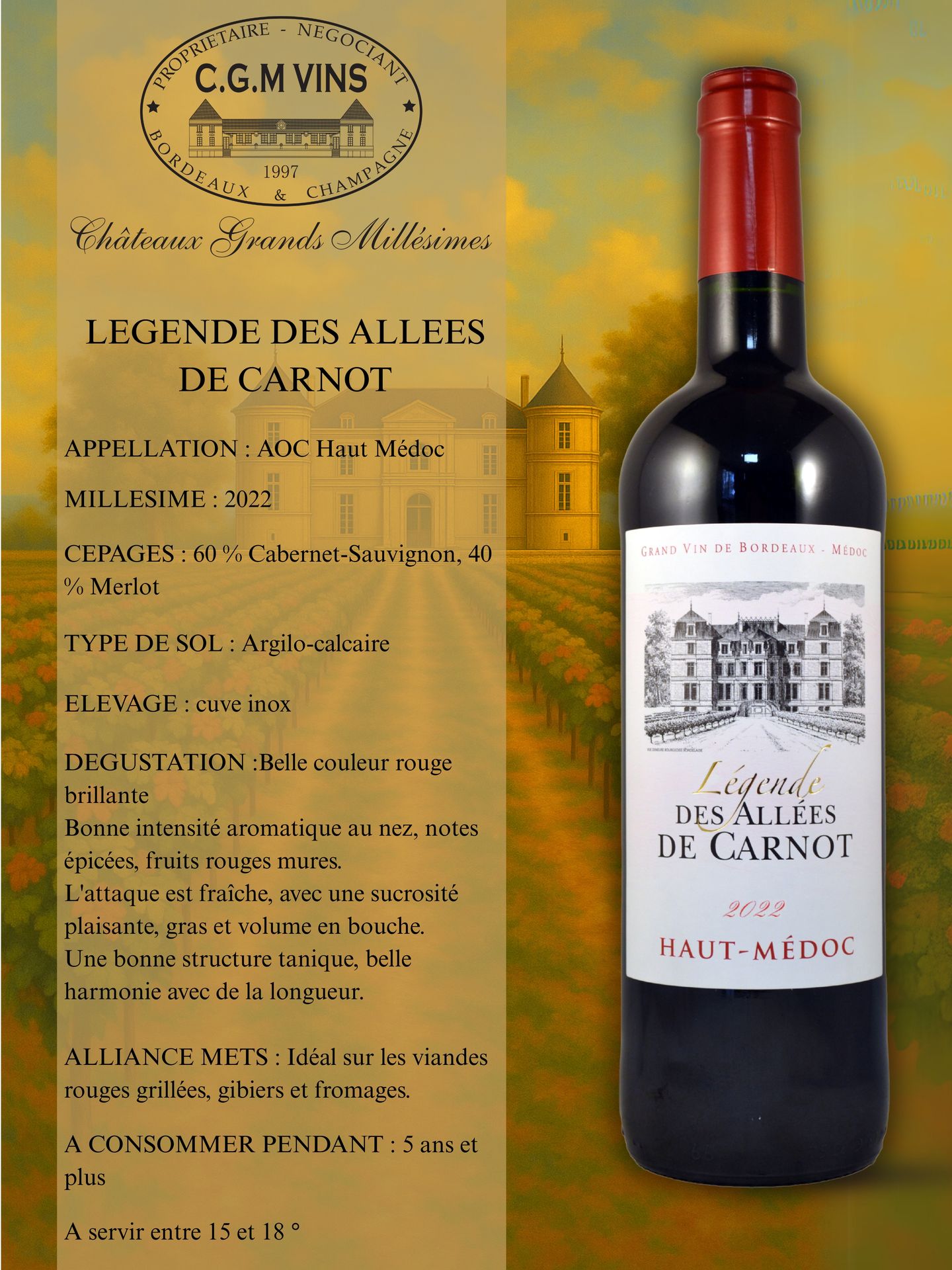 Au nord du Médoc, entre fleuve et océan, un terroir argilo-calcaire donne naissance à un vin authentique et généreux: la Légende des Allées de Carnot.