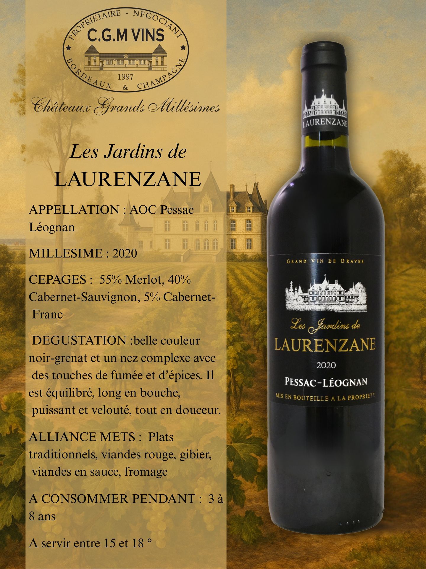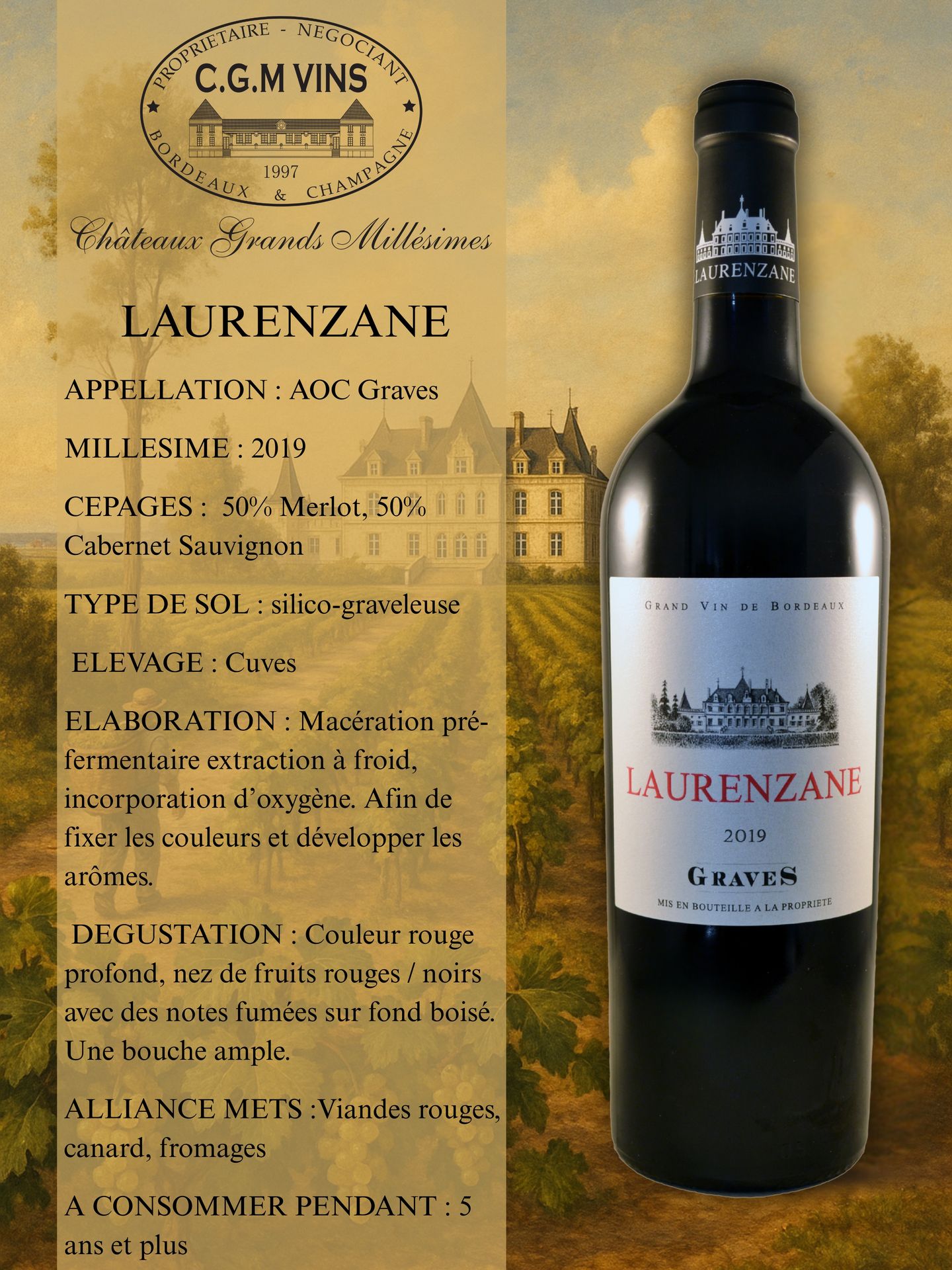 Au XIX° siècle LAURENZANE était la plus importante propriété de la commune de Gradignan, située aux portes de Bordeaux le domaine s'étendait alors sur plus de 100 hectares et produisait un magnifique vin des Graves très réputé. En l'honneur de ce vin mythique, CGM Vins emblématiques de Bordeaux a élaboré une cuvée d'exception à partir d'une sélection de vieilles vignes.
